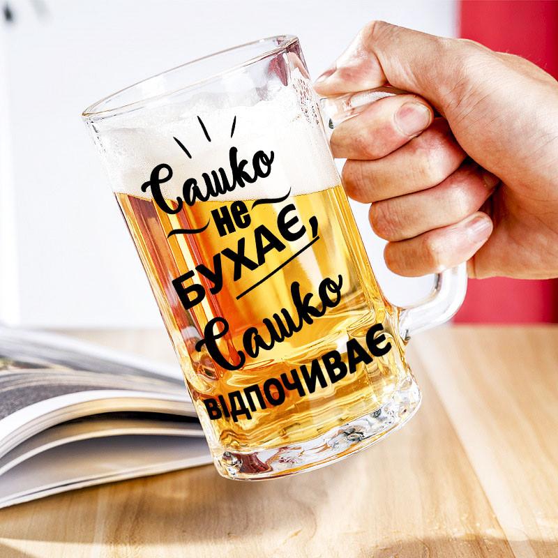 Пивний келих з написом "сашко не бухає, сашко відпочиває" - ім'я будь-яке