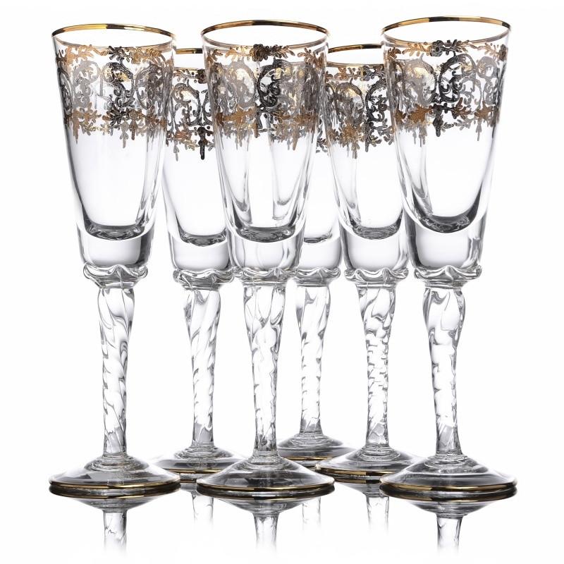 Набір келихів із серії Палермо ТМ LORA для ігристих вин підкорить серця всіх поціновувачів цього прекрасного напою. Унікальна ручна робота італійських майстрів і розпис 24-каратним золотом і платиною буде радувати око, а елегантні келихи у формі бутона тюльпана дозволять довше зберегти аромат напою. Вишукані фужери для шампанського Палермо прикрасять ваш святковий стіл, а також стануть чудовим подарунком для друзів і близьких. Мити келихи потрібно вручну з мийним засобом, крім абразивних порошків і паст, які можуть залишити на поверхні подряпини.