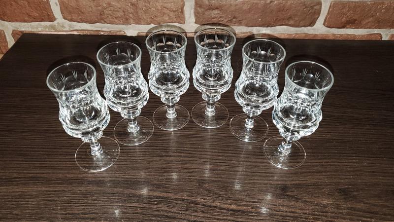 Винтажный набор изысканных 6-х бокалов Каждый бокал имеет утонченный дизайн с разнообразными гранями Без скоб и трещин Данный набор станет прекрасным дополнением к вашему сервизу. Дод. фото на запит Объем бокалов 100мл Размер на фото