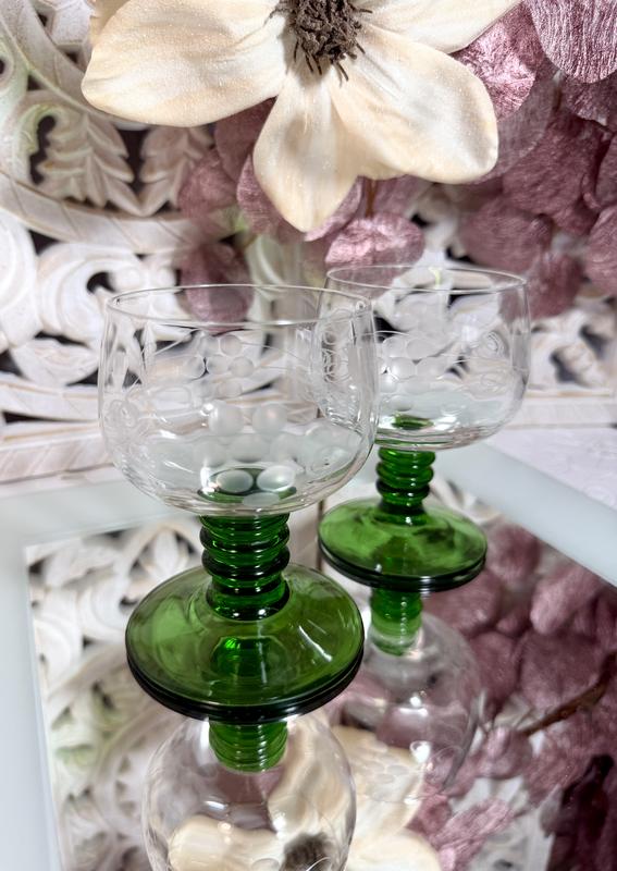 ❗️❗️❗️🛎️🛎️🛎️На замовлення. ⚜️ Набір: 2 шт. Вінтажний набір ромерів Luminarc (келих для вина або лікеру) з зеленою ніжкою у формі бджолиних сот і травленням у вигляді виноградної лози. Виробник: Luminarc, Франція. Стиль: Вінтажний, у стилі середини століття (MCM retro). Особливості: Зелена ніжка у формі бджолиних сот та матове травлення виноградної лози/грона на чаші. Призначення: Використовуються як келихи для вина (особливо білого) або лікеру. У чудовому вінтажному стані: без сколів та тріщин. 💸Ціна/2 шт.