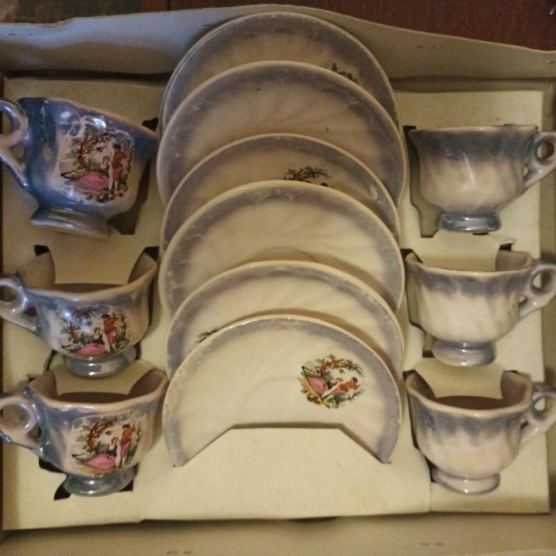 Новий набір, з малюнком в стилі "пастораль", у використанні не був. Фаянс. 12 предметів. Усі в наявності. Діаметр блюдця 12,5 см, чашечки - 6,5 см, її висота - 5,5 см.