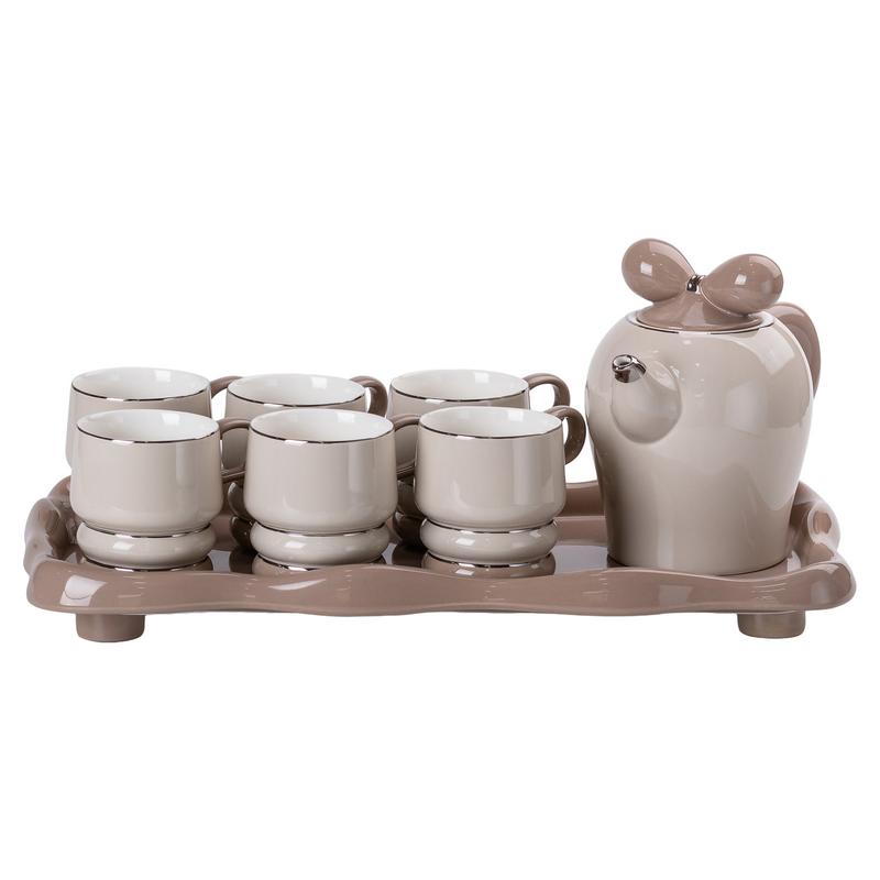 Керамічний чайний сервіз на 6 персон - це прекрасний вибір для тих, хто прагне створити затишну атмосферу на дружніх зустрічах і сімейних чаюваннях. До комплекту входять шість чашок, чайник і підставка, яка ідеально підходить для подачі чаю, десертів, солодощів і снеків. Чайник із високоякісної кераміки забезпечує тривале збереження тепла напою, а чашки, виконані за сучасними стандартами, гарантують міцність і довговічність. Набір універсальний і підходить для подачі як гарячих, так і холодних напоїв, що робить його функціональним для будь-яких заходів. Характеристики: Об'єм чайника: 1,4 літра Об'єм чашки: 300 мл Матеріал: кераміка Розміри: 45*22*20 см Комплектація: Чайник 6 чашок Керамічна підставка Переваги сервізу: Зручна підставка: полегшує подачу і сервірування частувань. Якість і теплоізоляція: кераміка зберігає тепло і стійка до зношування. Універсальність: чашки підходять для напоїв будь-якої температури. Елегантність: стильний дизайн впишеться в будь- який інтер'єр. Ідеальний подарунок: стане чудовим презентом для будь-якого свята.