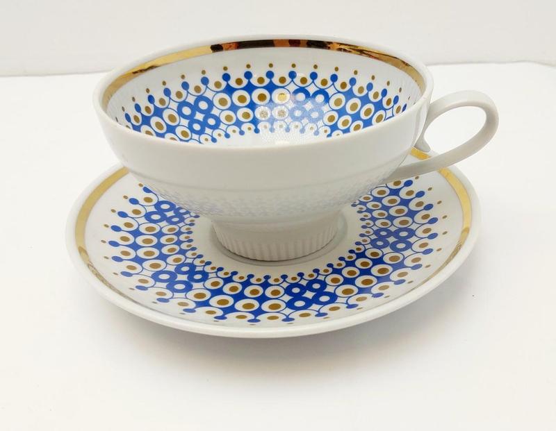 Порцеляновий чайний набір Weisswasser Чайний порцеляновий набір Набір для сніданку з блакитними мотивами та золотими прикрасами Чашка висота 5,5 см, діаметр 10см Блюдце діаметр 14см Виробник Німеччина Товар б/в (є ще більша тарілка, але з дефектом - буде в подарунок)