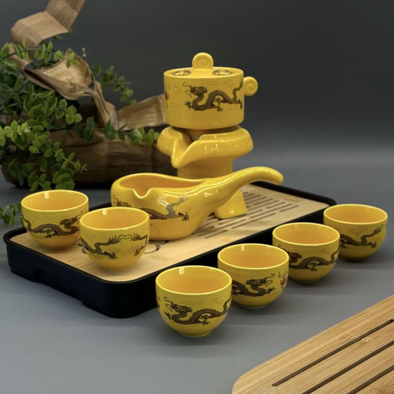 Опис: Пориньте в атмосферу стародавнього Китаю з розкішним чайним набором у стилі гунфу-ча - справжнім символом величі та витонченості чайної церемонії. Цей вишуканий набір виготовлено з якісної кераміки насиченого жовтого кольору - відтінку, який у китайській культурі символізує імператорську владу, процвітання і благополуччя. Кожен елемент прикрашений витонченими зображеннями драконів - легендарних створінь, що приносять силу, удачу і захист. Набір включає: - 1 чайник гунфу незвичайної форми, - 1 чахай (молочник), - 6 піал для чаю, - 1 чажень - тримач для чайника у вигляді чаші. Завдяки своїй унікальній формі і яскравому оформленню, набір не тільки зручний у використанні, але і стане ефектною прикрасою чайної зони. Він ідеально підійде як для практики гунфу-ча, так і для подарунка цінителю східної культури. Зробіть кожен чайний ритуал особливим із цим чудовим набором - у ньому поєднуються традиції, естетика і сила символів.