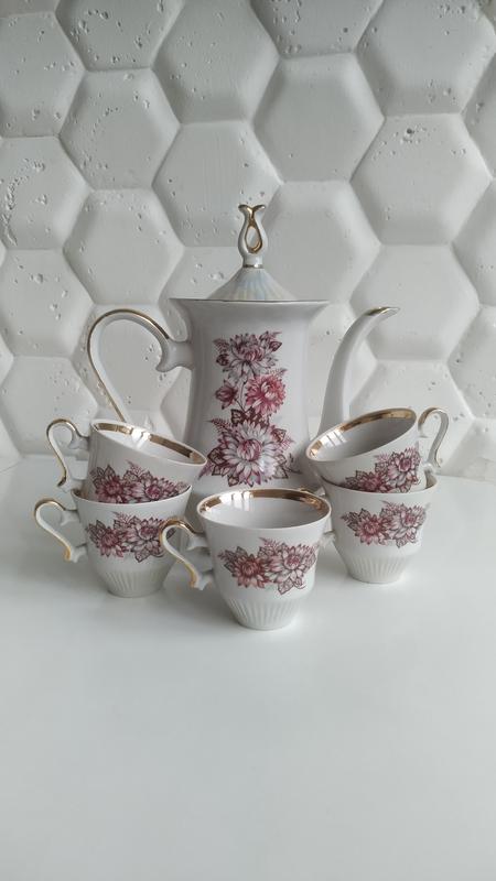 Набор из чайника с крышкой и 5 чашек, с золотом и перламутром. Состояние хорошее, а если почистить будет еще красивее. Можно для фотостудии, для ретро декора или для повседневного пользования. Отстираю при полной оплатке на карточку.