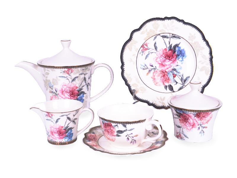 Чайний набір Lefard Камелія на 21 предмет 935-013 Набір складається із 6 чашок і 6 блюдець, чайник, цукорниця, молочник + набір тарілок 6 шт. 21 см матеріал порцеляна Об'єм кухля: 220 мл; Упакований у подарункову коробку.