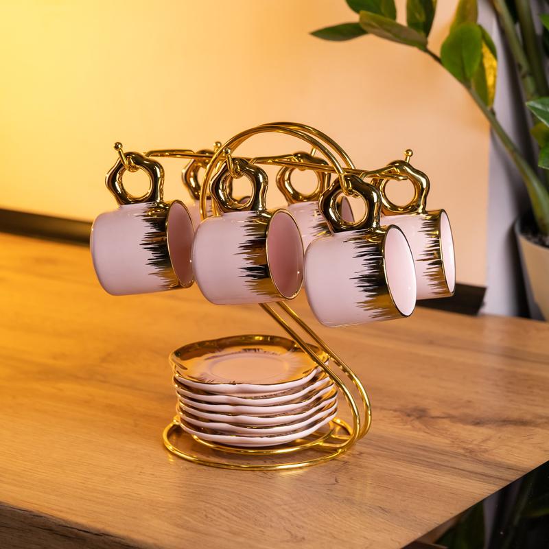Фарфоровий кавовий сервіз на стильній металевій підставці поєднує в собі красу та зручність. До комплекту входять шість чашок і шість блюдець, акуратно розміщених на підставці, що дає змогу економно використовувати простір і створювати акуратне сервірування. Основні характеристики кавового сервізу на металевій підставці Об'єм чашки: 100 мл; Верхній діаметр чашки: 5 см; Нижній діаметр чашки: 5 см; Діаметр блюдця: 11 см; Матеріал чашок: порцеляна; Матеріал підставки: метал. Металева підставка не тільки має гарний вигляд, але й надійно фіксує всі елементи. Сервіз стане чудовим вибором як для повсякденного використання, так і для святкових випадків.