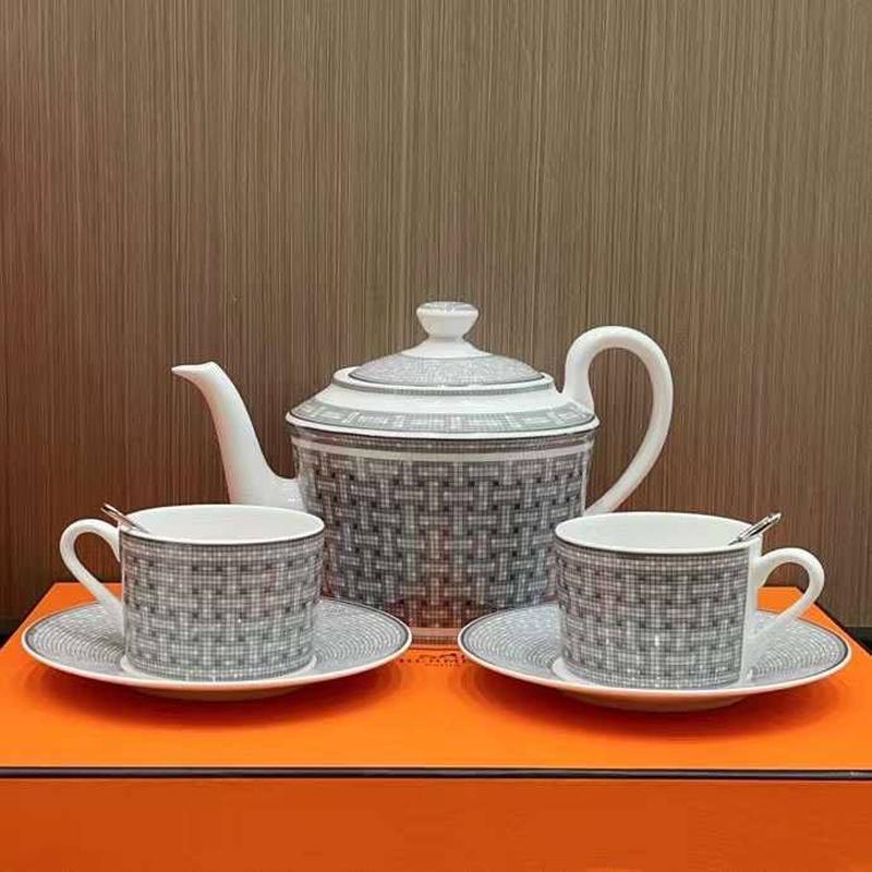 В наявності два набори - перший - чайник на 800 мл, 2 чашки, 2 блюдце та 2 ложечки, все с лого брендіровані, в коробці, нові. Другий - 2 чашки та 2 блюдце, обидва в сірих кольорах - Hermes Mosaique platinum, перший набір з чайником - 5800, другий 2700.