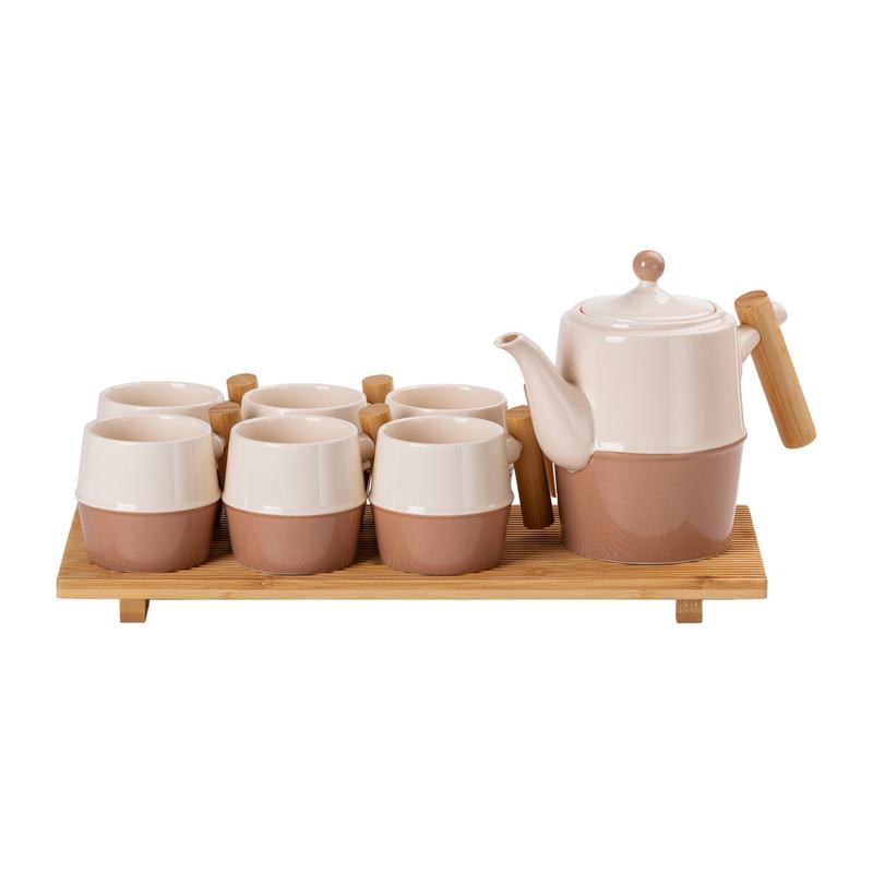 Чайний сервіз на бамбуковій підставці - це елегантний керамічний набір із 8 предметів, який вдало поєднує стиль і практичність. Виконаний у коричнево- білій гамі, він надає інтер'єру природної естетики та сучасного вигляду. У комплект входять чайник об'ємом 1,3 л і шість чашок по 300 мл. Бамбукові ручки на чайнику і чашках додають тепла і природної чарівності, а підставка з бамбука забезпечує зручне зберігання. Характеристики: Матеріал: Кераміка, бамбук Кількість персон: 6 Об'єм чайника: 1,3 л Об'єм чашок: 300 мл Ручки: Бамбукові (на чайнику і чашках) Комплектація: Чайник 6 чашок Бамбукова підставка Переваги сервізу: Переваги сервізу: Естетика і натуральність: поєднання кераміки та бамбука. Функціональний дизайн: зручні ручки та підставка для зберігання. Затишок і гостинність: створює особливу атмосферу для чаювань. Екологічність: бамбукові елементи підкреслюють турботу про довкілля. Чудовий подарунок: стильний набір для дому та зустрічей із гостями.