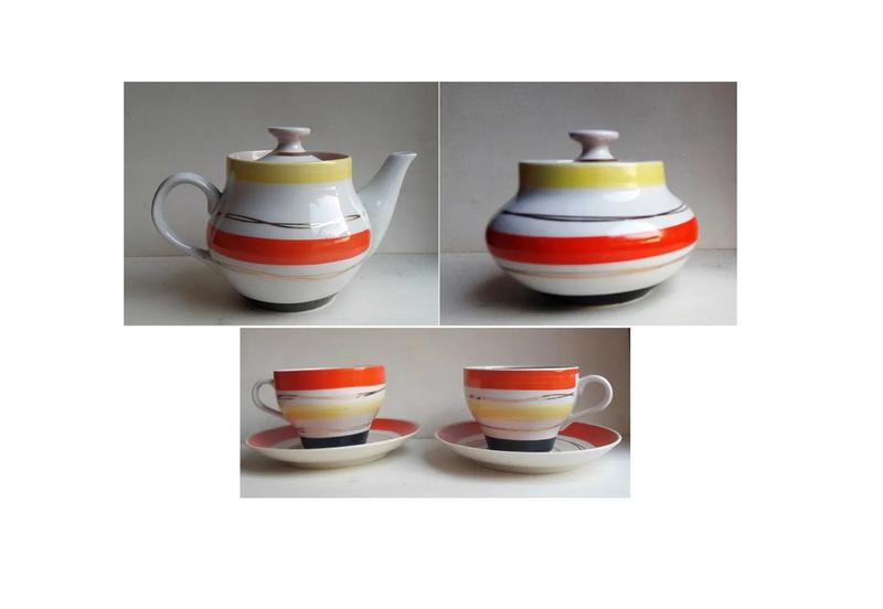 Порцеляновий чайний сервіз на 11 осіб Виготовлений на Барановському порцеляновому заводі в 60-х роках Чашка — висота 7 см, діаметр 8,5 см — 11 штук Блюдце — висота 2,5 см, діаметр 14 см — 11 штук Чайник/заварник — висота 12 см Цукорниця — висота 9,5 см Стан дуже гарний — без відколів і тріщин