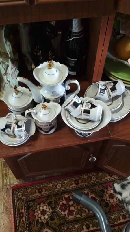 фарфоровий кавовий сервіз Пегас 6 чашок з блюдцями,конфетничка, чайник,цукорниця,молочник,чотири тарілки,немає одного блюдця,випущений до 1500 л. Києва