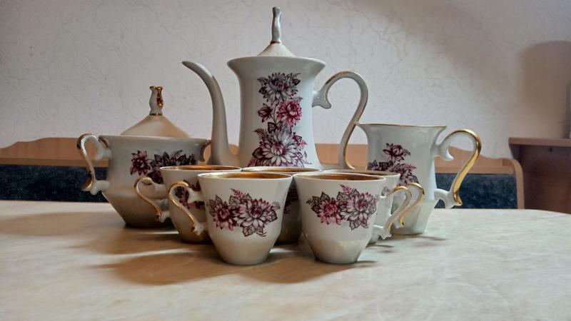 чайник 5 чашек сахарница молочник (одна чашка с небольшим дефектом, он показан на фото)