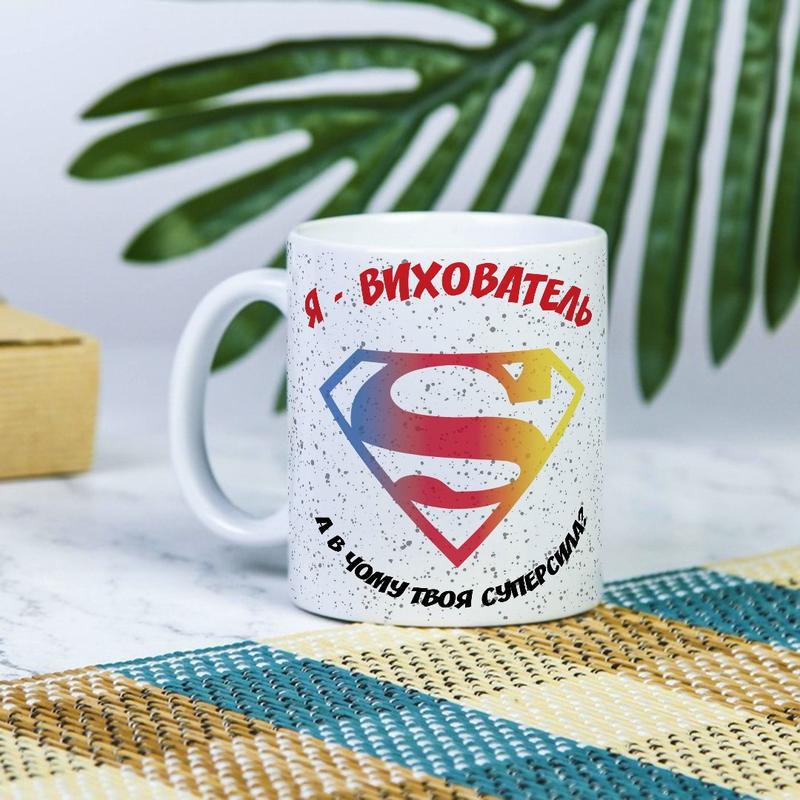 Біла чашка на подарунок з написом "я вихователь, а в чому твоя суперсила?" 330 мл