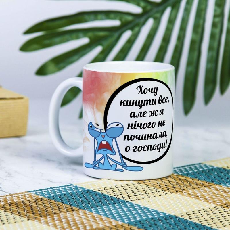 Белая чашка на подарок с надписью "хочу все бросить, но я же ничего не начинала, о господи...