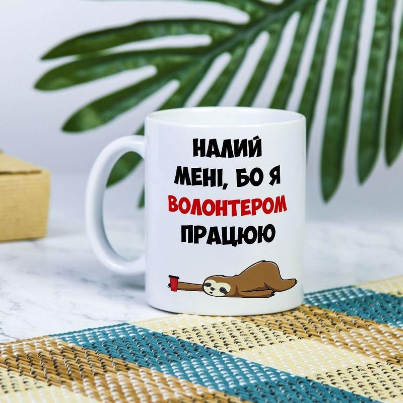 Біла чашка на подарунок з написом "налий мені, бо я волонтером працюю" 330 мл
