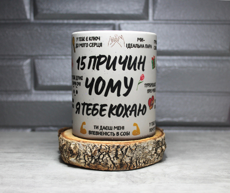Горнятко хамелеон "15 причин чому я тебе кохаю" Можна зробити принт начашці хамелеон з вушком сердечком. Об'єм чашки 330 мл. Чашка з сублімаційним принтом. Чудовий подарунок на будь-яке свято. Можливість переносу на чашку будь-який інший задум: фото, надпис, картинку. Або можем підібрати макет, спеціально для вас. Великий вибір чашок, з кольоровим обідком, з кольоровою серединою, чашки хамелеони. Зображення, яке наноситься на чашку розраховане на тривалий термін використання, не стирається, не вигоряє Доставка по Україні Новою поштою, Укрпоштою, Міст Експрес. Термін виконання 24 години. Всі чашечки відправляються в транспортувальних коробках.