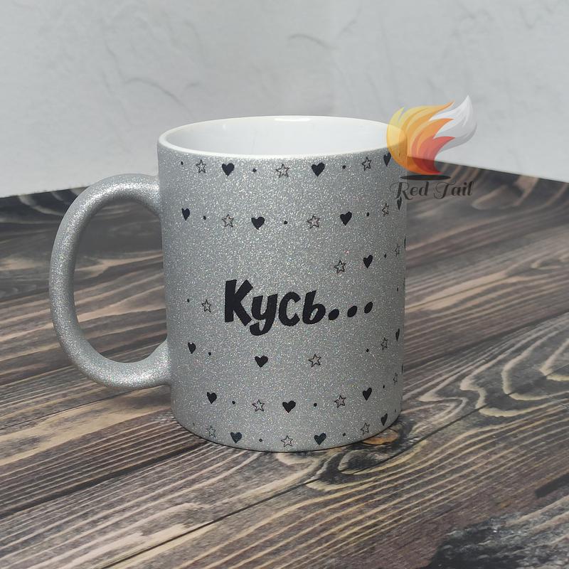 Чашка подарункова "кусь" 330 мл глітерна срібна (блискітки)