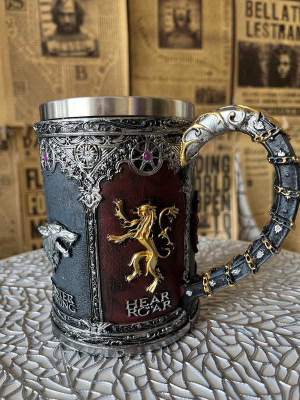 Уточнюйте наявність перед замовленням Об'єм 500 мл Усередині метал Зверху «під метал» На поверхні зображені герби всіх королівства Вестероса, разом із гаслами, кожен — у своєму власному кольорі та фактурі Пишіть буду рада