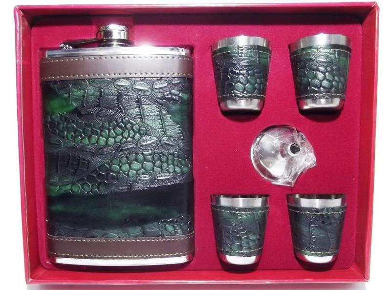 Кілька примірників у наявності Набір: фляга + 4 чарки + лійка. Об'єм фляги: 240 мл Продається гуртом та в роздріб з доставкою по Україні Країна виробник: Китай Призначення фляги: Для алкогольних напоїв Матеріал: Нержавіюча сталь Об`єм: 0.24 л