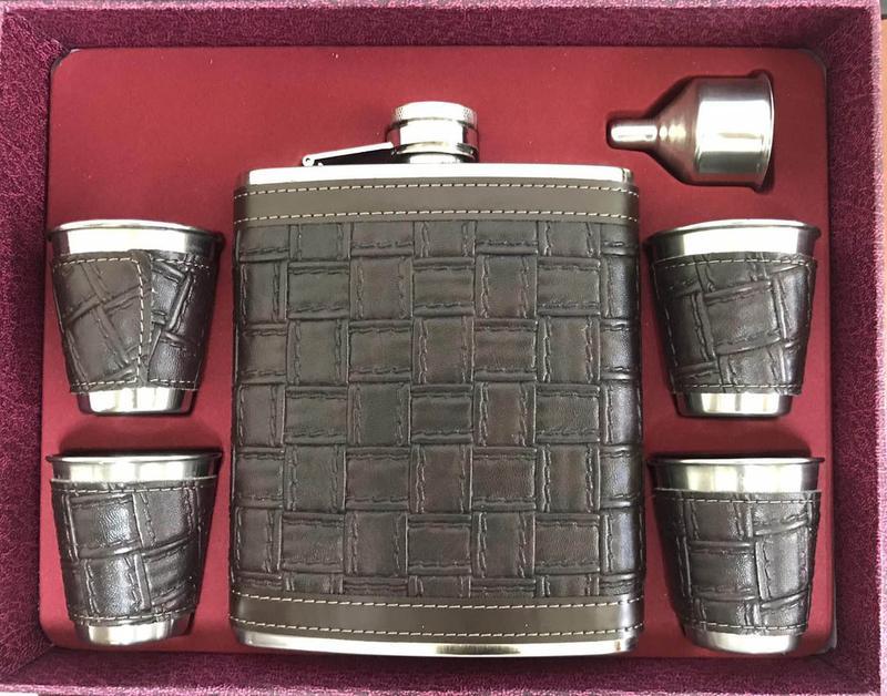 Кілька примірників у наявності Подарунковий набір: фляга з чарками і лійкою 540мл в шкіряній палітурці Продається гуртом та в роздріб з доставкою по Україні Країна виробник: Китай Призначення фляги: Для алкогольних напоїв Матеріал: Нержавіюча сталь Об`єм: 0.54 л