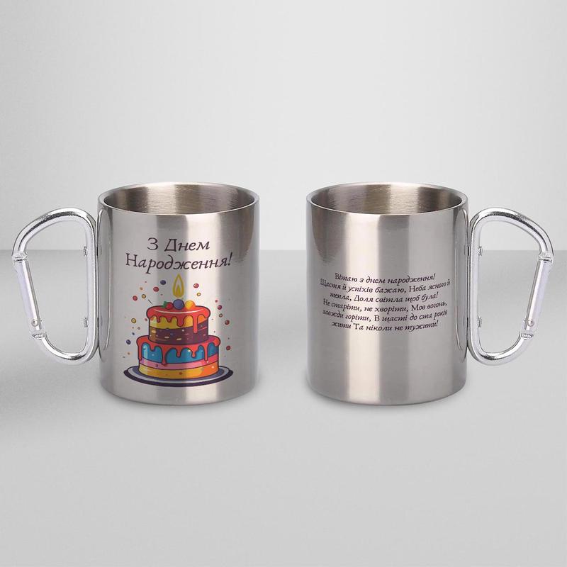 Кружка металева з карабіном "з днем народження" 300 мл срібляста