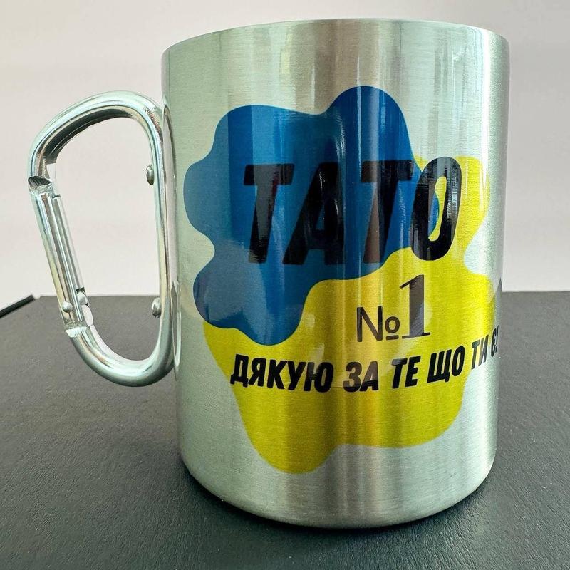 Кружка металева з карабіном "тато №1 дякую за те що ти є" 300 мл срібляста