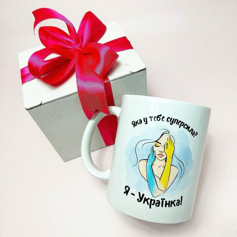 Кружка керамічна з принтом "супер сила українка" 330 мл у подарунковій коробці з бантом |...