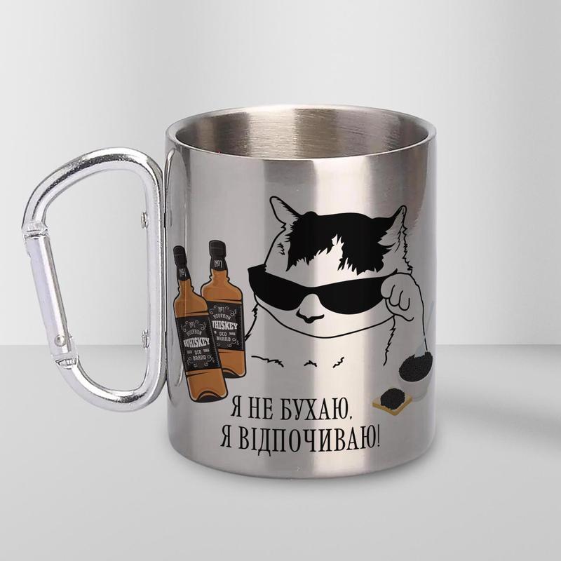 Кружка металева з карабіном "я не бухаю, я відпочиваю" 300 мл срібляста