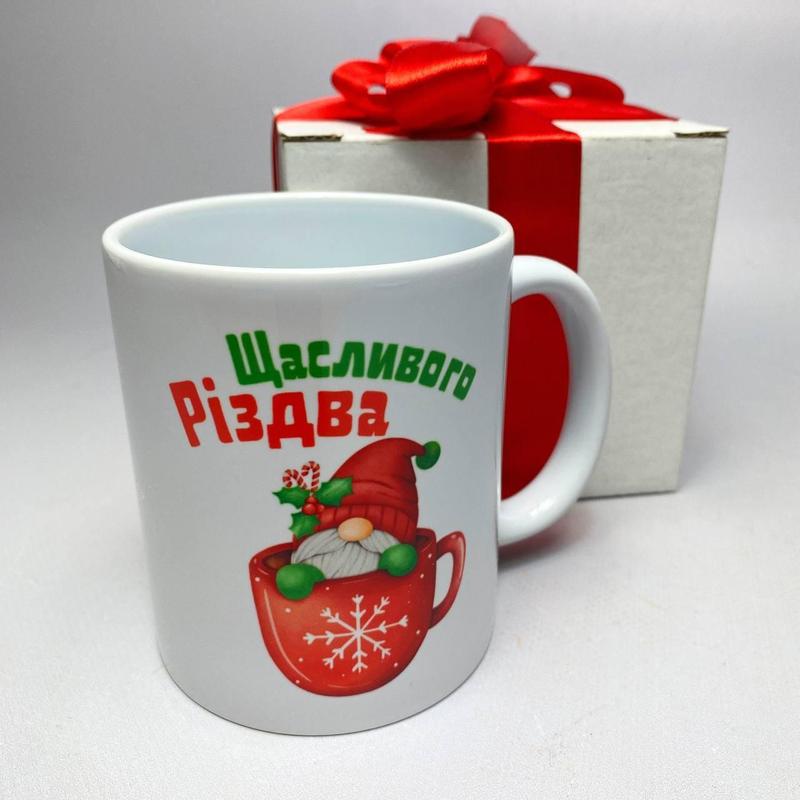 Кружка керамічна з принтом "щасливого різдва" 330 мл у подарунковій коробці з бантом