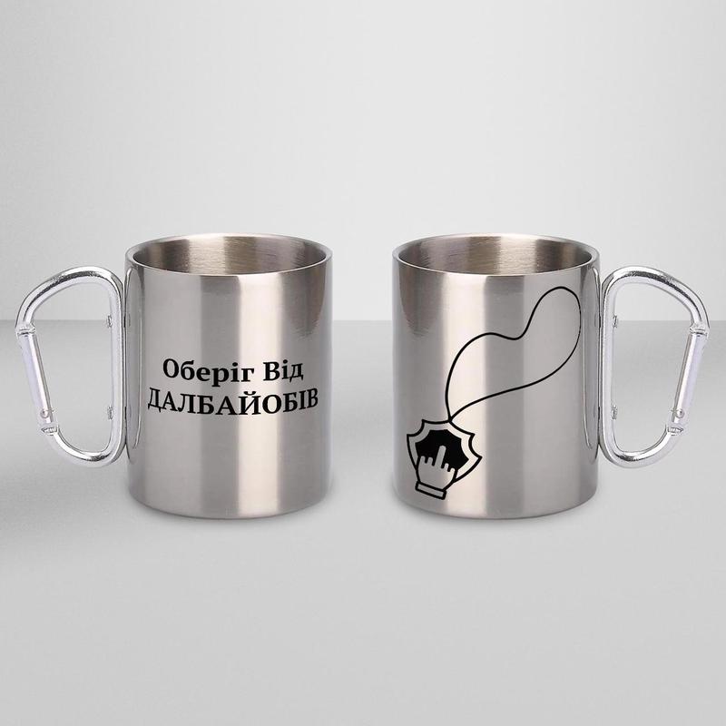 Унікальність нашої кружки в тому, що вона має подвійні стінки, а це означає, що напій надовго залишиться гарячим і при цьому не буде обпалювати руки. Завдяки зручній ручці у вигляді карабіна кружка може кріпитися до пояса або на рюкзак. - Матеріал: метал; - Спосіб нанесення принту: сублімація; - Об'єм: 300 мл; - Висота: 9 см - Діаметер: 7,6 см - Призначення: для чаю, кави, води або інших напоїв. УВАГА! Ми не рекомендуємо мити кружки в посудомийній машині, щоб не пошкодити принт.
