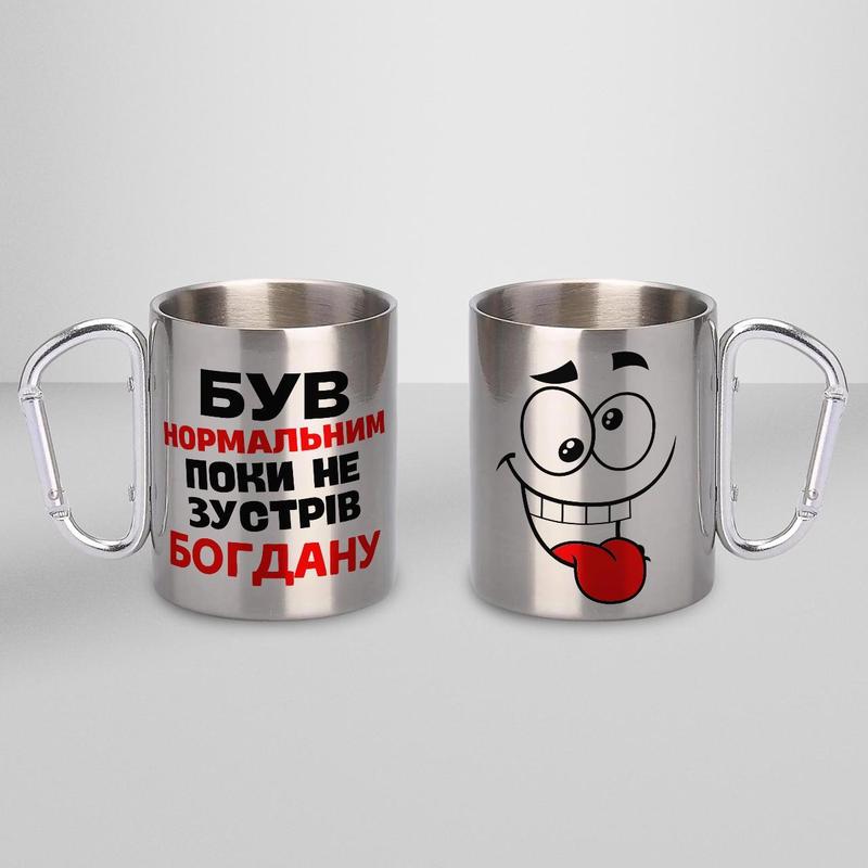Кружка металева з карабіном "був нормальним поки не зустрів богдану" 300 мл срібляста