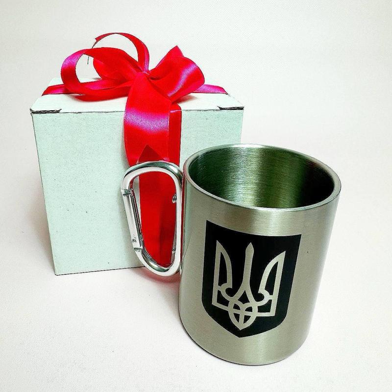 Кружка металева з карабіном "герб україни" 300 мл у подарунковій коробці з бантом