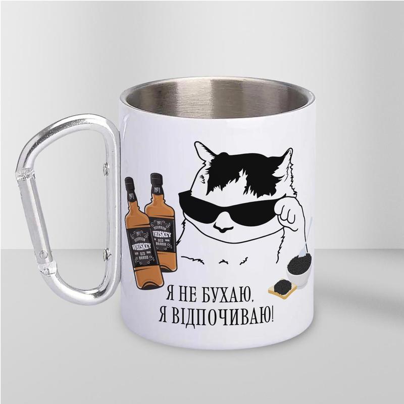 Кружка металева з карабіном "я не бухаю, я відпочиваю" 300 мл біла |швидка доставка|