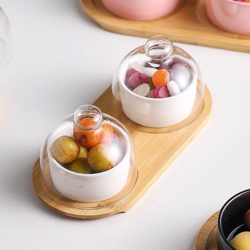 Набір вазочок для снеків 2 шт з кришками на бамбуковій таці білі