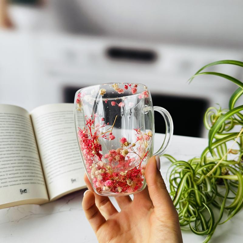 Оригінальна чашка з ефектом "замороженого" букета всередині - це не просто посуд, а справжній витвір мистецтва. Між подвійними скляними стінками композиція з натуральних сухоцвітів, яка не в'яне і дарує затишок щодня. Переваги: • Подвійні стінки довше зберігають температуру напою і не обпалюють руки. • Унікальний дизайн: кожна чашка – з неповторною композицією із сухоцвітів. • Екологічні матеріали – боросилікатне скло, безпечне для здоров'я. • Ідея для подарунка – підходить для будь-якого приводу.