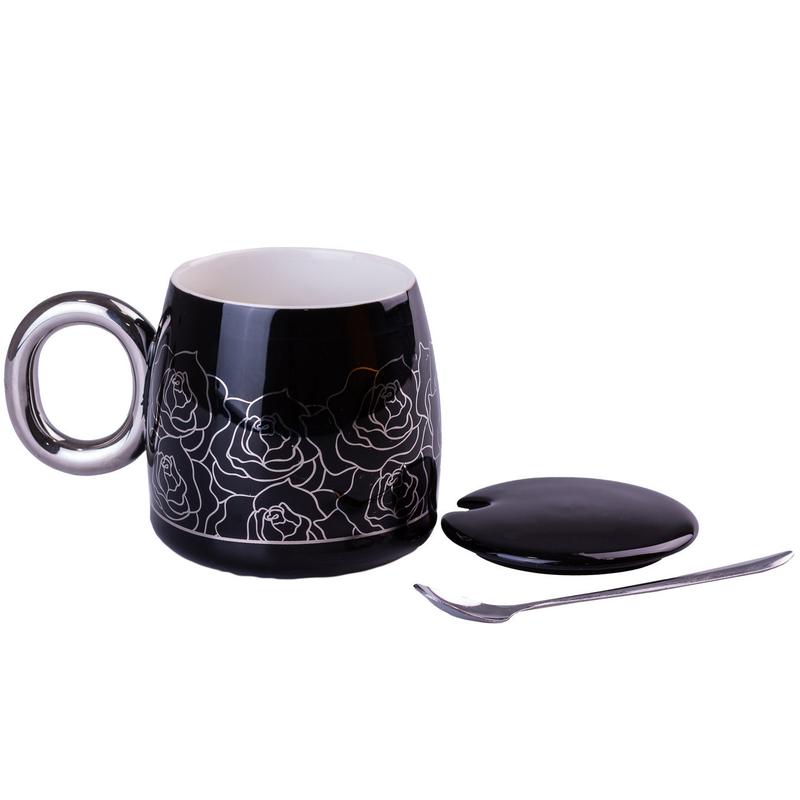 Чашка керамічна golden romance 400мл з кришкою і ложкою кухоль для чаю чорний hp405b
