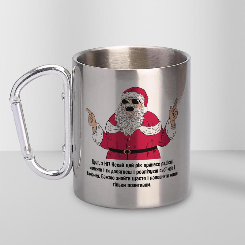 Кружка металева з карабіном "новорічна" 300 мл срібляста|швидка доставка|