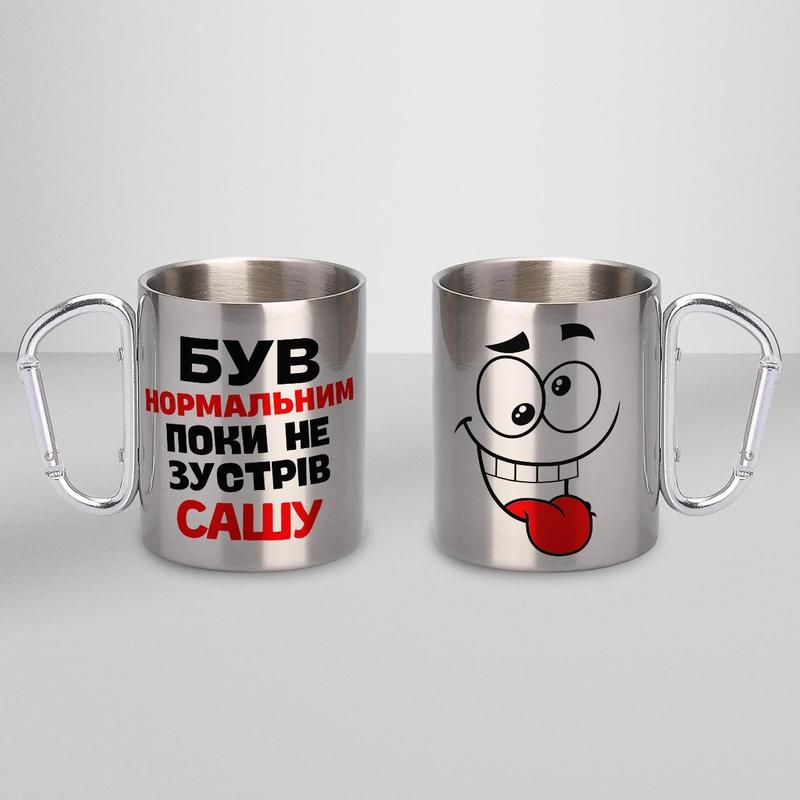 Кружка металева з карабіном "був нормальним поки не зустрів сашу" 300 мл срібляста