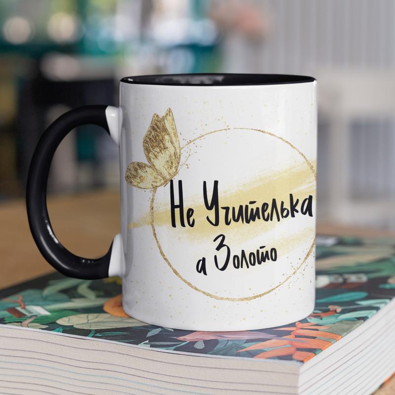 Чашка керамічна з принтом "не учителька а золото" 330 мл, біла з чорною ручкою