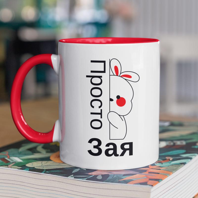 Чашка керамічна з принтом "просто зая" 330 мл, біла з червоною ручкою