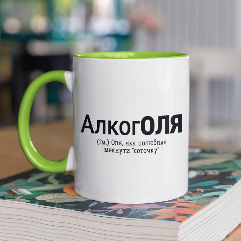 Чашка керамічна з принтом "алкоголя" 330 мл, біла з зеленою ручкою
