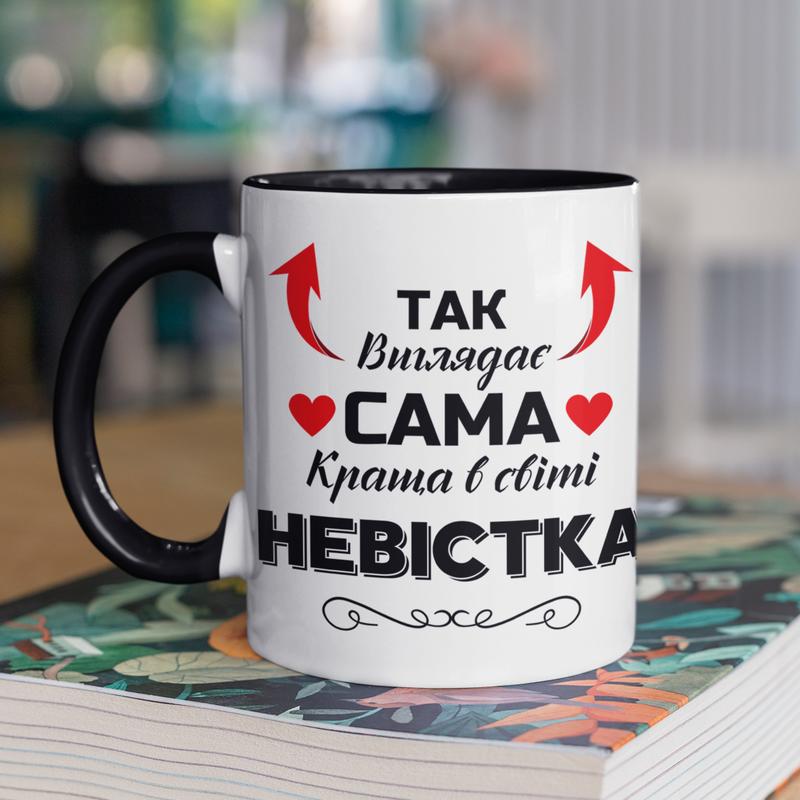 Чашка керамічна з принтом "так виглядає сама краща в світі невістка" 330 мл, біла з чорною...