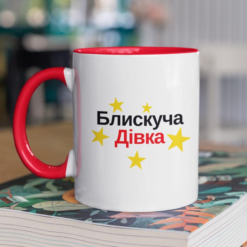 Чашка керамічна з принтом "блискуча дівка" 330 мл, біла з червоною ручкою