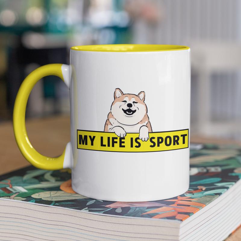 Чашка керамічна з принтом "my life is sport" 330 мл, біла з жовтою ручкою