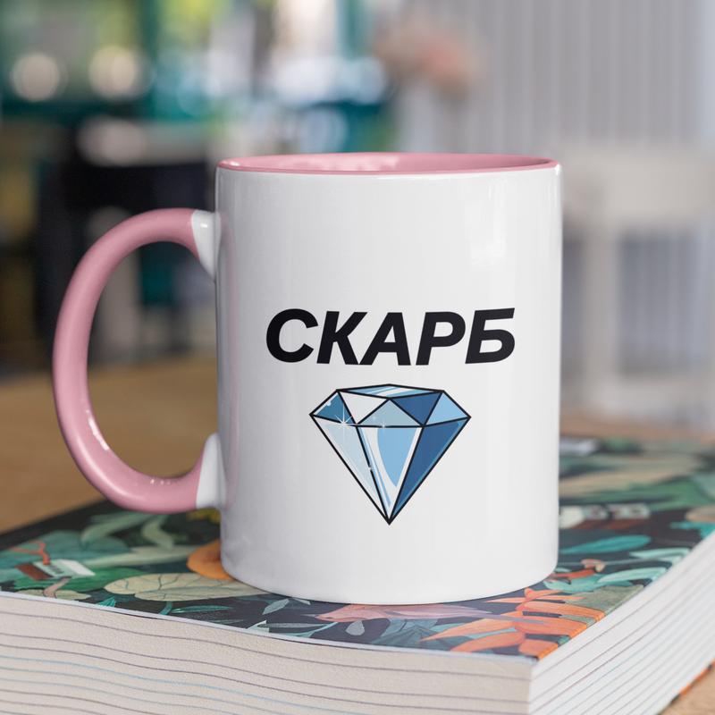 Чашка керамічна з принтом "скарб" 330 мл, біла з рожевою ручкою