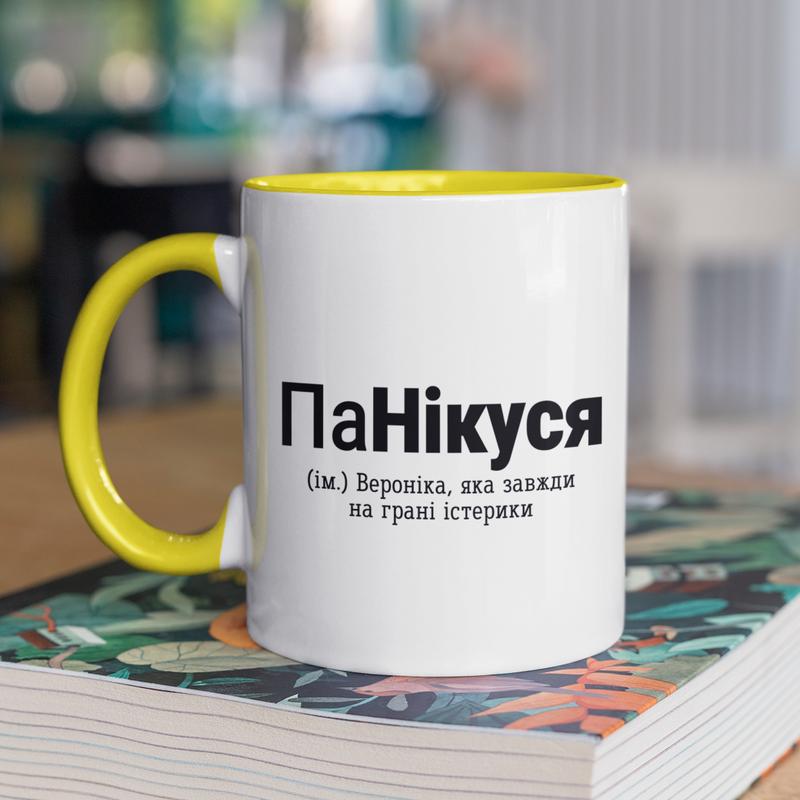 Чашка керамічна з принтом "панікуся" 330 мл, біла з жовтою ручкою