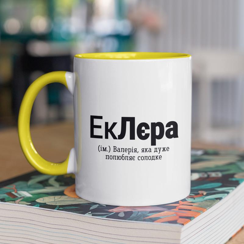 Чашка керамічна з принтом "еклєра" 330 мл, біла з жовтою ручкою
