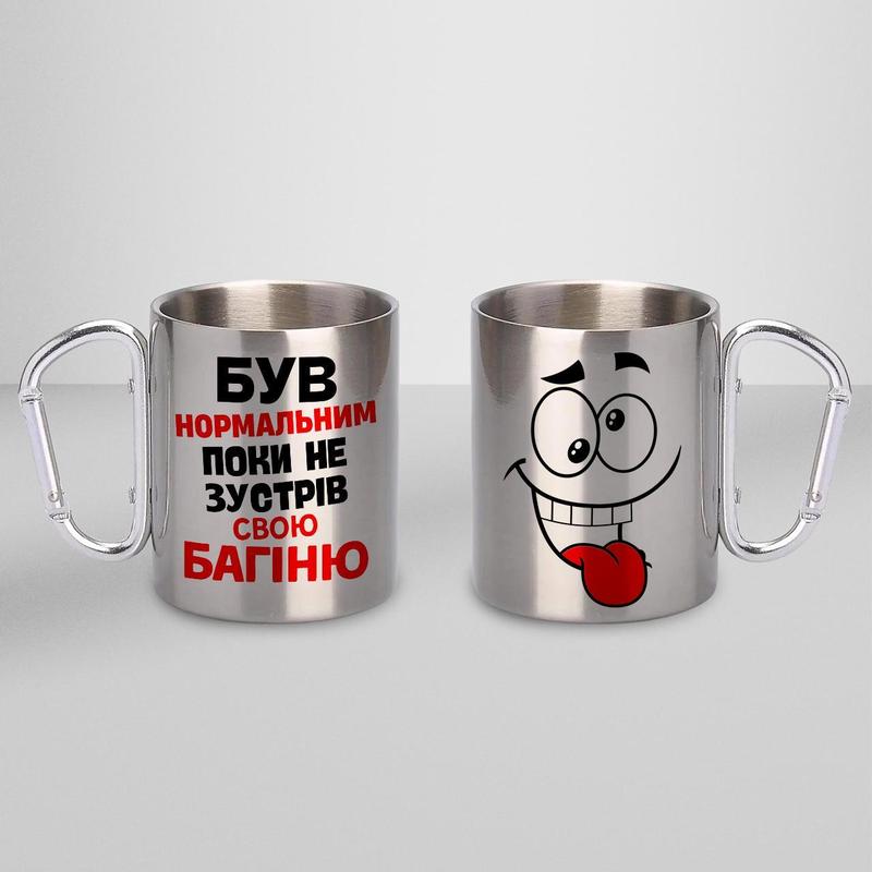 Чашка металева з принтом "був нормальним поки не зустрів багіню" 300 мл з карабіном, срібл...
