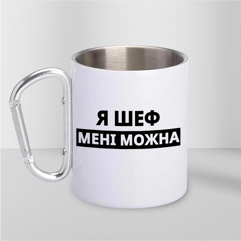 Чашка металева з принтом "я шеф мені можна" 300 мл з карабіном, біла