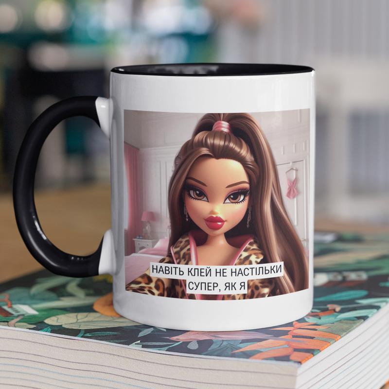 Чашка керамічна з принтом "клей не настільки супер як я" 330 мл, біла з чорною ручкою